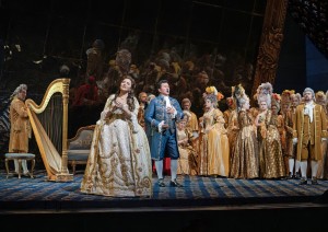 舞台装置や衣装が非常に凝っていて、例えば最初の伯爵家の舞踏会の場面(左上写真:Webのライブビューイング紹介記事より)では、貴族の女性たちはパニエドレスに、髪の毛を逆立てて高く結い上げた髪型、頬には紅がべったりついている化粧法(男性も)など、マリー・アントワネット時代の宮廷ファッションが忠実に取り入れられていました。それは現代の眼から見ると滑稽で★2526④《アンドレア・シェニエ》20cKaren-Almond/Metropolitan-Opera-2-scaled、主人公のマッダレーナだけが髪をそのままおろした髪型に、紅をつけない自然なメークで、他の女性たちとの差異化が図られていました。また、シェニエが捕まって、革命裁判にかけられる場面(右写真)では、実際の革命裁判所の内部によく似た造りになっていました。多くの人々を死刑にした悪名高い検事のフーキエ=フォト★2526④《アンドレア・シェニエ》1cKaren-Almond/Metropolitan-Operaタンヴィルが裁判所の一番上で仕切っている様子など、革命劇を見ているようでした。最後に断頭台に向かう直前にシェニエとマッダレーナが歌う場面(二重唱<君のそばにいると>は、熱情と悲痛の入り混じった素晴らしく感動的な歌声でした!)(左写真)では、二人の背景にある大きな石柱の土台に「自由(LIBERTÉ)」という文字が刻まれていて、その真ん中に血が流れていて、まさに「ヴェリズモ」を反映した舞台装置になっていました(他にもマラーの石像がさりげなく背景にあったり、革命歌「サ・イラ」や「カルマニョール」が流れていたり、史実が巧みに挟み込まれていました)。